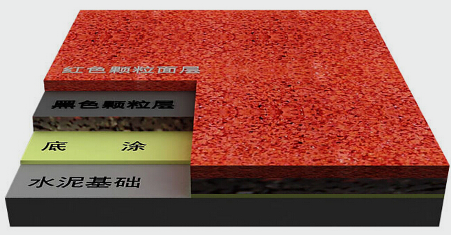 全塑型塑膠跑道材料具有自流平效果,固化后表面平坦,符合比賽場地要求,采用專用的高彈性EPDM顆粒噴面,顆粒狀表面防眩目工藝能有效地遏制刺眼光線反射,提供適度的運動摩擦系數,并可定制多種色彩搭配場地方案。